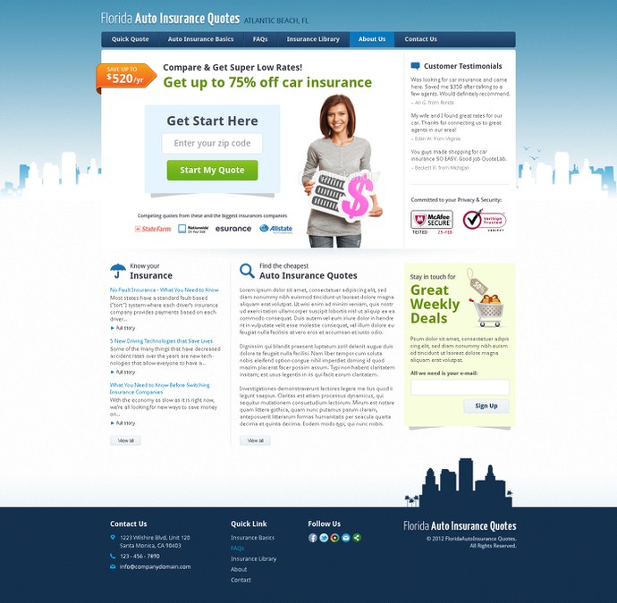 Auto insurance quotes florida. It takes less than five minutes to enter some basic information about your driving history your car and the coverage youre looking for. Before you get a quote make sure to visit our florida auto coverage page to learn your states minimum coverage requirements. Known as the sunshine state florida is the perfect place for riding around with the top down.